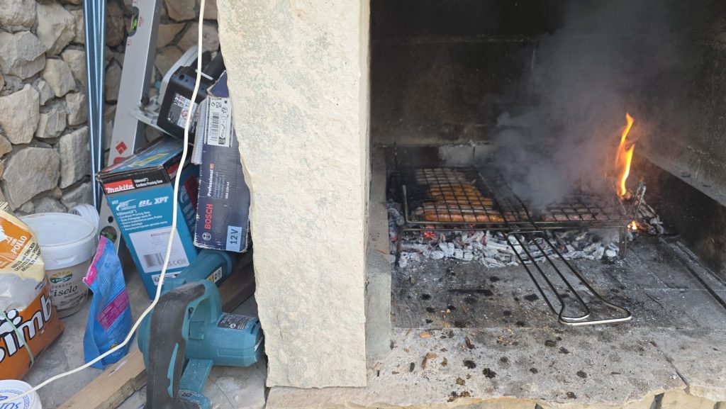 Kaum war der Balken halbwegs fixiert, kamen Nataša, Stipe und Snježana auf einen Kaffee vorbei. Angela hatte Ćevapčići und Würstchen besorgt, Stipe brachte Weinrebenholz für den Grill – aus dem Kaffee wurde ein gemütlicher Abend. Ein echter Fjaka -Moment.