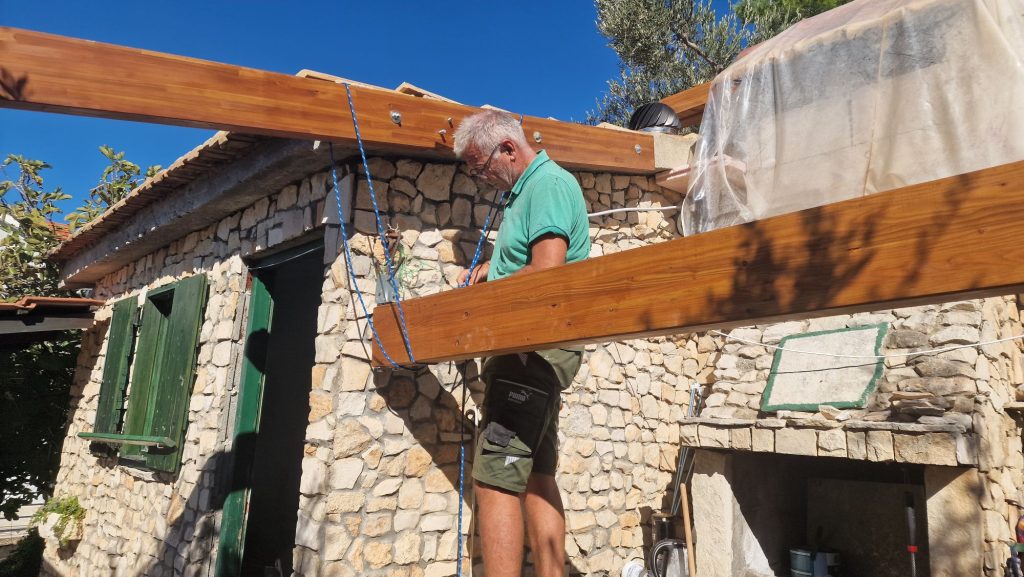 Montag ging’s weiter am Kutak . Ein weiterer Sechs-Meter-Balken musste hoch – ohne Luftanker, dafür mit Provisorien: Hebel, Kanthölzer und ein schnell um einen Balken gelegter „Flaschenzug“. Zwei Mal „auf ditschen“ blieb nicht aus, am Ende lag er doch dort, wo er sollte. Ein alter Telefonmast erwies sich als morsch; den habe ich gekürzt und in einen Metallfuß gesetzt. Angela hat anschließend alle Balken noch einmal gestrichen.