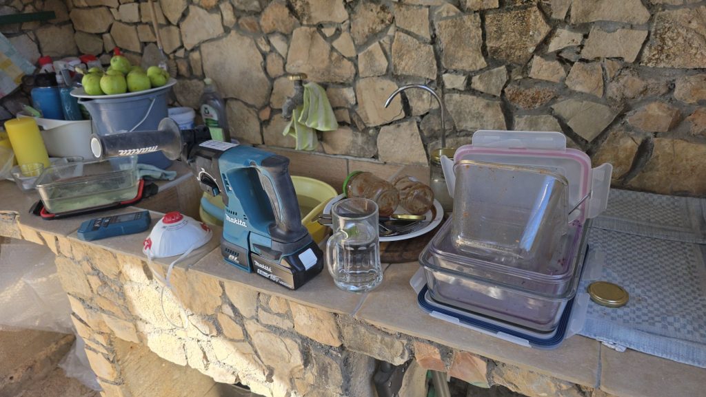 Am Donnerstag Nachmittag rief wieder der Kutak . Die Erweiterung der Küche stand an – und die alte Steinwand musste weichen. Bei der Hitze war das ein schweißtreibender Job, aber am Ende war der Weg frei. Die Dusche konnte ich dadurch endlich fertig anschließen, auch wenn es inzwischen gefühlt die fünfte Variante der Rohrführung war. Nur der Durchlauferhitzer geht ohne Solarinverter noch nicht. Die die Hausscherung der Nachbarn ist dafür nicht ausgelegt.