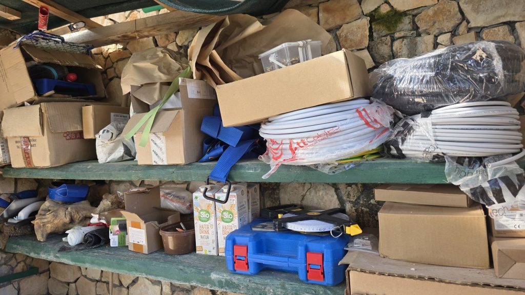 Angela übernahm derweil eine Zwischenmission: Branko hatte angerufen, ob wir bei seinen Gästen nach den Sonnenschirmen schauen könnten. Leider waren die irreparabel – also fuhr Angela nach Korčula, um neue zu besorgen. Doch die Maße passten nicht ganz, die Schirme wackelten wieder fröhlich im Wind. Wenigstens war die Wand im Kutak erfolgreich entfernt.