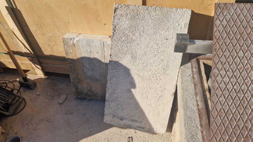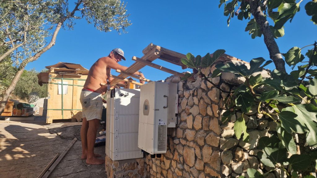 Am Montag habe ich nach der Arbeit die Betondecke wieder in Angriff genommen. Zwei von vier Elementen habe ich geschafft, dann wurde es spät. Also schnell den Grill angeworfen – das Fleisch musste weg. Im Anschluss habe ich noch das Dach für Wechselrichter und Batterien fertiggestellt. Es sollte Regen in der Nacht kommen, und so war zumindest die Überdachung fertig.